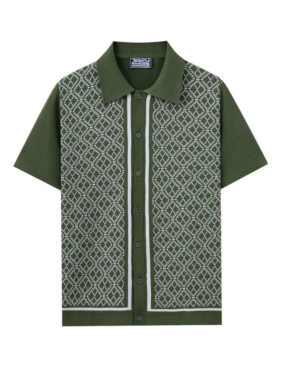 - Upgrade your summer wardrobe with this vintage-inspired men's knit shirt. Featuring a bold geometric pattern on the front panel, this short-sleeve shirt combines retro charm with modern comfort. Crafted from breathable, soft-touch fabric, it offers all-day wearability with a classic button-down front and structured collar.