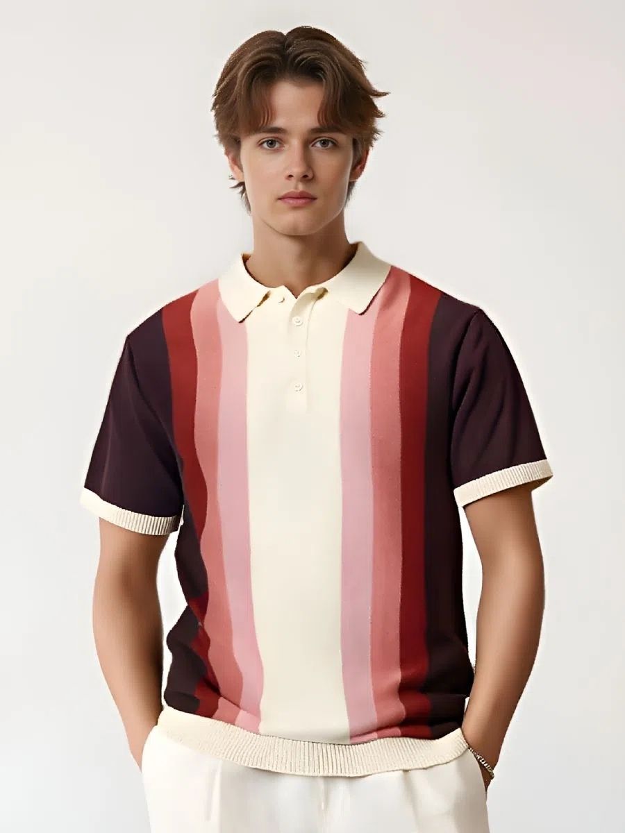 - This shirt features a vertical stripe design in warm earth tones, this short-sleeve polo offers a classic yet modern aesthetic. Crafted from lightweight, breathable knit fabric, it ensures all-day comfort and style.